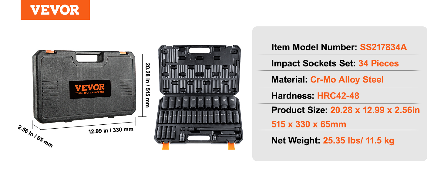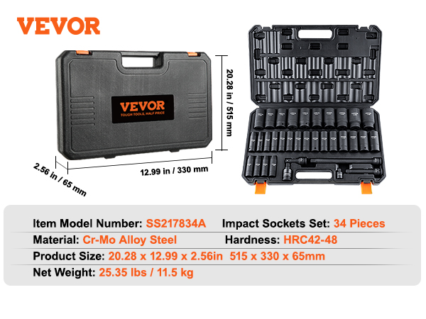 Are you looking for a professional and portable set of impact sockets? VEVOR’s 34-piece impact socket set offers a complete range of tools, especially suitable for repairing different brands of automobiles.