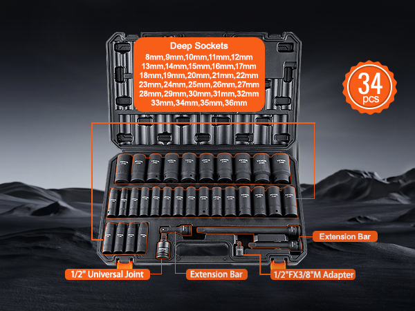 - Abundant Components: This comprehensive set includes an array of components, such as deep sockets 8mm, 9mm, 10mm, 11mm, 12mm, 13mm, 14mm, 15mm, 16mm, 17mm, 18mm, 19mm, 20mm, 21mm, 22mm, 23mm, 24mm, 25mm, 26mm, 27mm, 28mm, 29mm, 30mm, 31mm, 32mm, 33mm, 34mm, 35mm, 36mm. Other components include extension bars in lengths of 3",5",10", 1/2" impact universal adapter, 1/2"F x 3/8"M adapter.