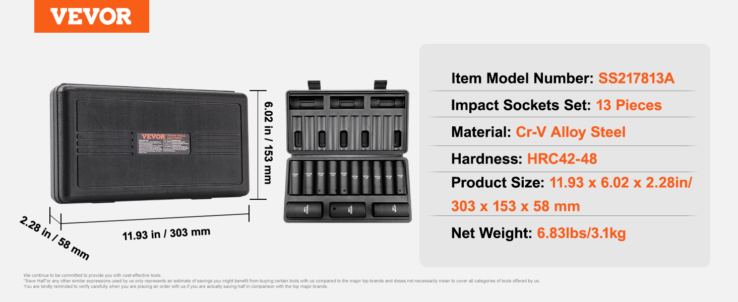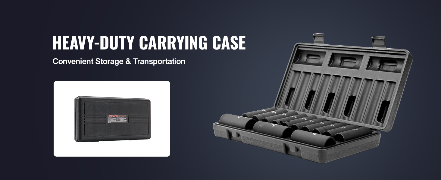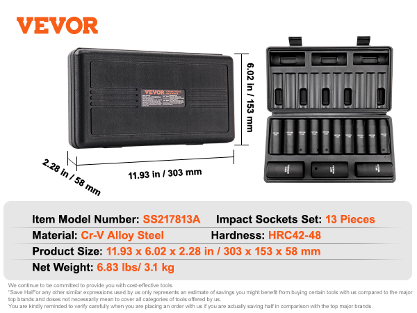 Are you looking for a professional and portable set of impact sockets? VEVOR’s 13-piece impact socket set offers a complete range of tools, especially suitable for repairing different brands of automobiles.