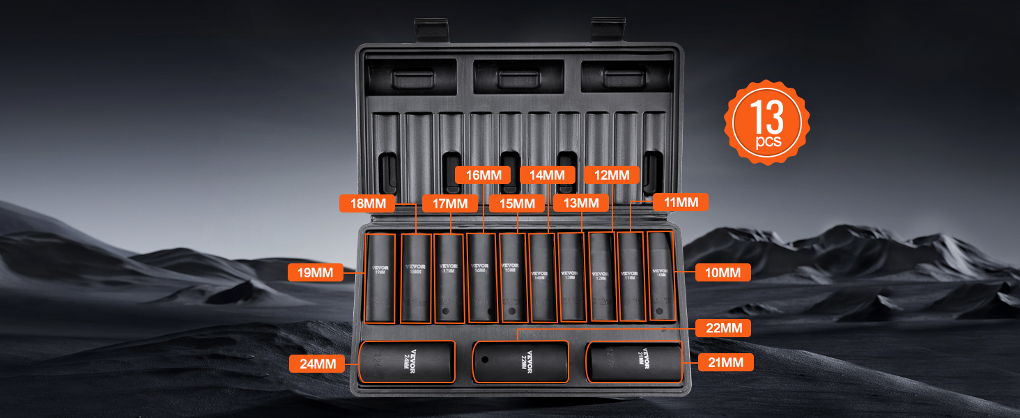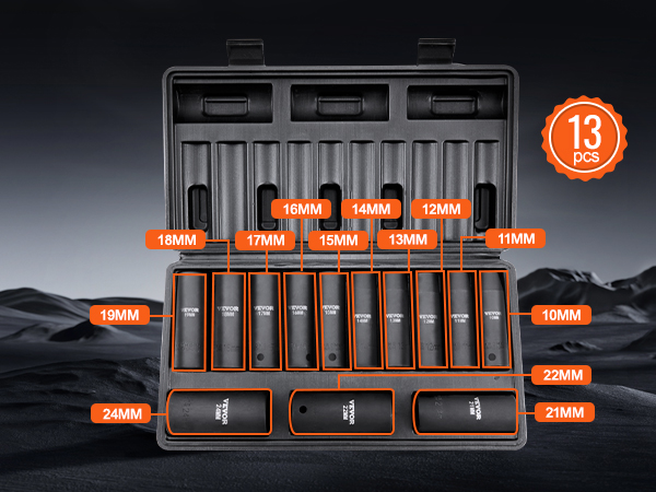 - Abundant Components: This comprehensive set includes 13pcs metric deep impact sockets: 10 mm, 11 mm, 12 mm, 13 mm, 14 mm, 15 mm, 16 mm, 17 mm, 18 mm, 19 mm, 21 mm, 22 mm, 24 mm.