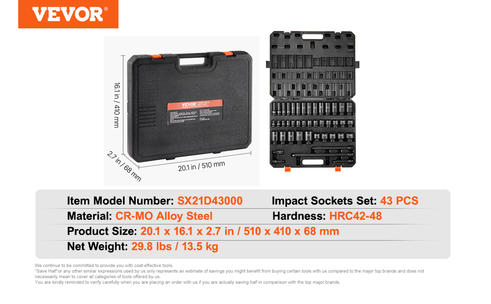 Are you looking for a professional and portable set of impact sockets? VEVOR’s 43-piece impact socket set offers a complete range of tools, especially suitable for repairing different brands of automobiles.