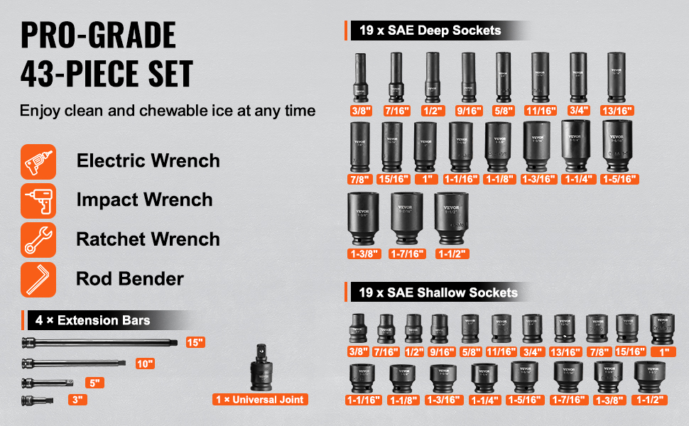 - Abundant Components: This comprehensive set includes 19pcs SAE deep sockets and 19pcs SAE shallow sockets: 3/8", 7/16", 1/2", 9/16", 5/8", 11/16", 3/4", 13/16", 7/8", 15/16", 1", 1-1/16", 1-1/8", 1-3/16", 1-1/4", 1-5/16", 1-3/8", 1-7/16", 1-1/2". It also includes 4 extension bars (3", 5", 10", 15") and a universal joint.