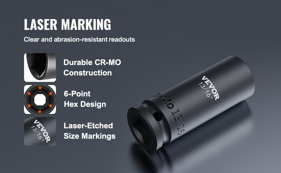 Using laser etching and rolling processes, the extra-large size markings on the sockets are clear and easy to identify even under various lighting conditions. The markings are also resistant to wear.