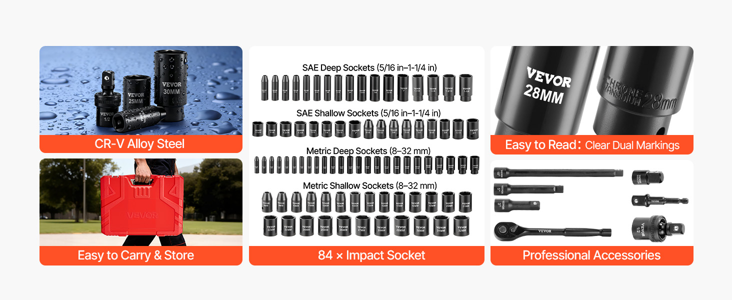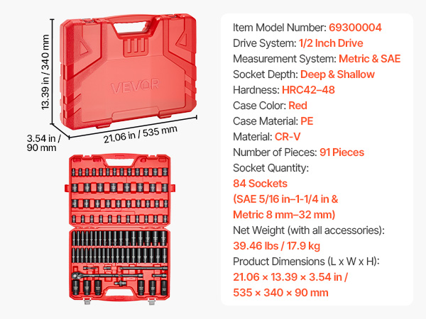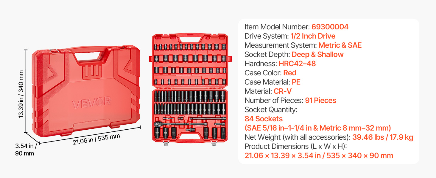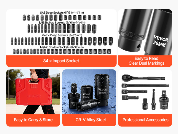 | Socket Quantity | 84 Sockets (SAE 5/16 in–1-1/4 in & Metric 8 mm–32 mm) |