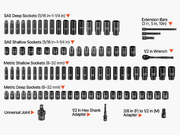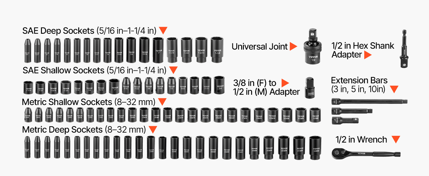 - Comprehensive 91-Piece Set: This impact socket set includes SAE shallow & deep sockets (5/16, 11/32, 3/8, 7/16, 1/2, 9/16, 5/8, 11/16, 3/4, 13/16, 7/8, 15/16, 1, 1-1/16, 1-1/8, 1-3/16, 1-1/4 in), Metric shallow & deep sockets (8, 9, 10, 11, 12, 13, 14, 15, 16, 17, 18, 19, 20, 21, 22, 23, 24, 25, 26, 27, 28, 29, 30, 31, 32 mm), three impact extension bars (3 in, 5 in, 10 in), universal joint, 1/2 in wrench, 1/2 in hex shank adapter, and 3/8 in (F) to 1/2 in (M) adapter