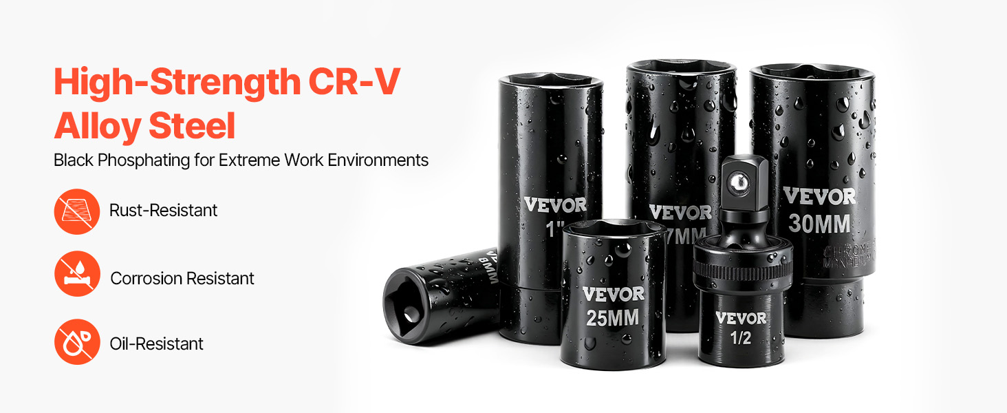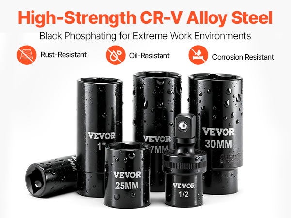- Durability You Can Trust: Crafted from premium CR-V alloy steel and heat-treated for extra toughness, this impact socket set handles high-impact torque without damaging. The black phosphate finish shields against water, oil, and rust.
