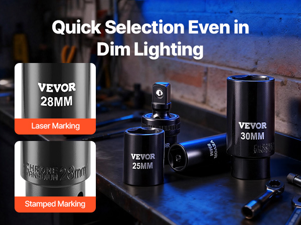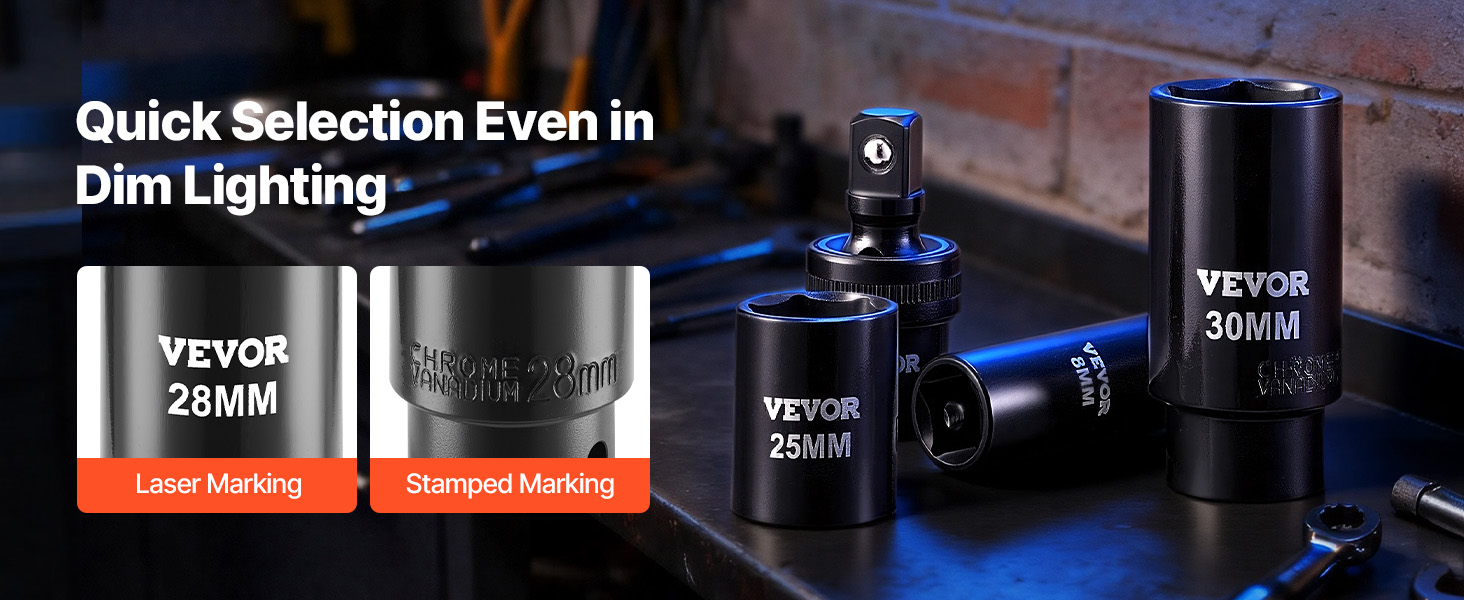 - Easy-to-Read Size Markings: Featuring laser and stamped markings, this impact socket set enables rapid size identification, even in low-light environments such as car undercarriages. The stamped design ensures wear resistance for long-lasting readability.