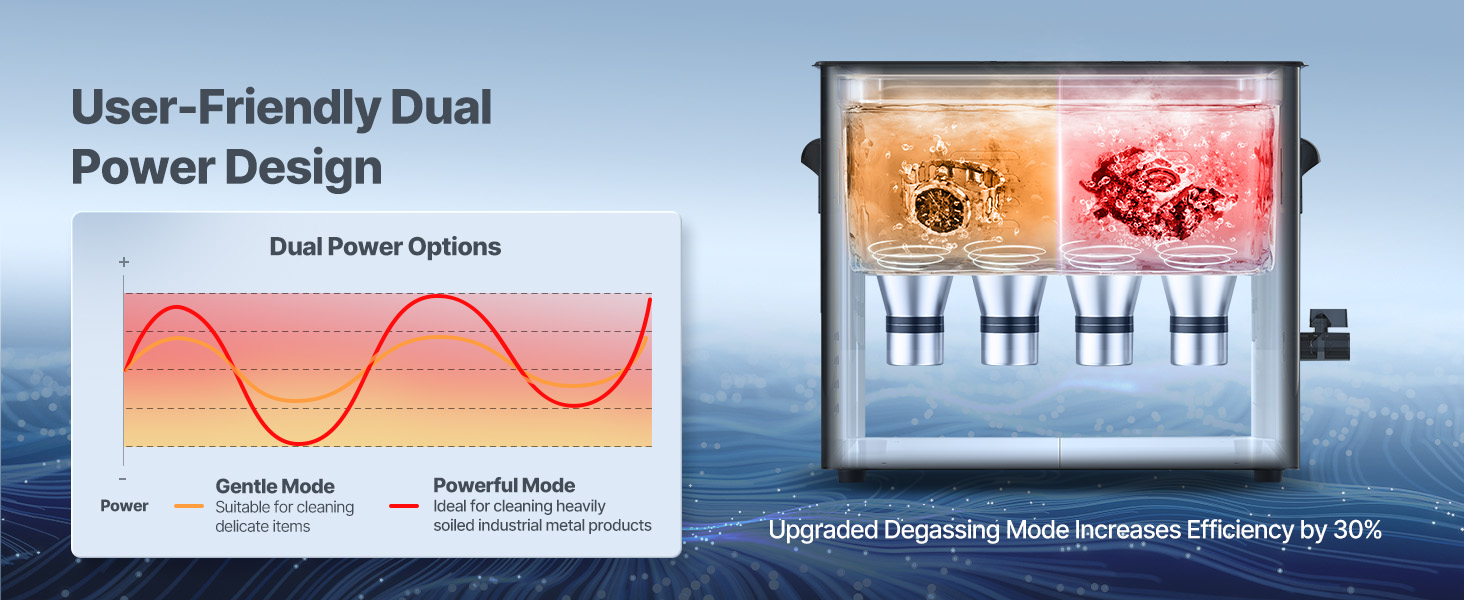 • Dual Power Modes: Degassing mode of this ultrasonic cleaner removes air from liquids, boosting efficiency by 30%. Dual power settings provide precise cleaning for delicate items or heavy-duty parts without damage