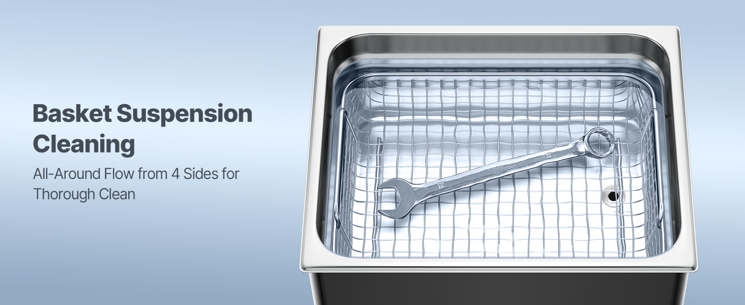 • Versatile Use: Our sonic cleaner with knob cleans a wide range of materials, from metals to precision instruments. Adjustable settings ensure optimal results for various items. Use the basket suspension for even cleaning and to protect the tank