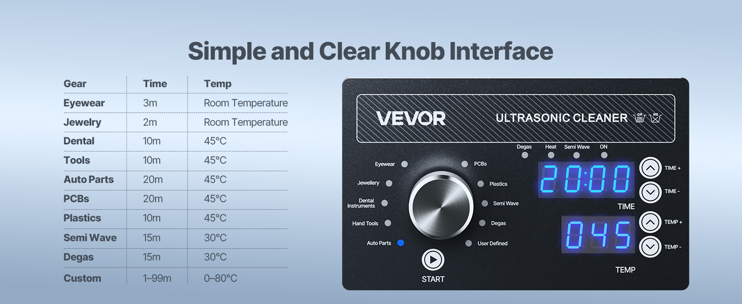 • Easy Operation: You can adjust frequency, time, and temperature with a simple knob. Quickly set the ideal parameters for jewelry, watches, and industrial parts with our ultrasonic parts cleaner