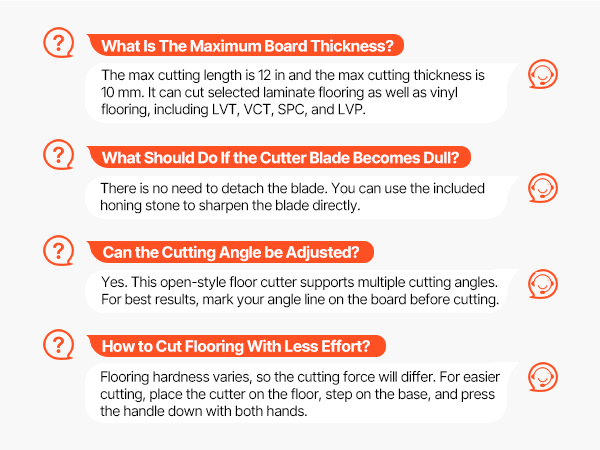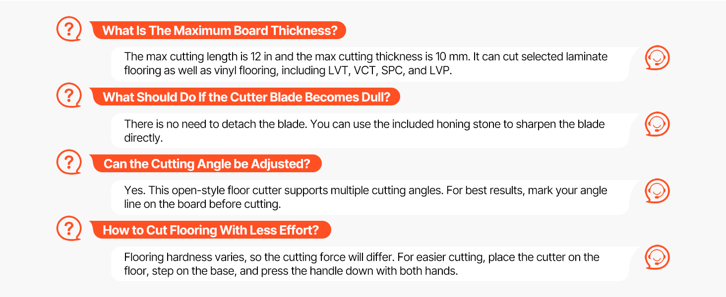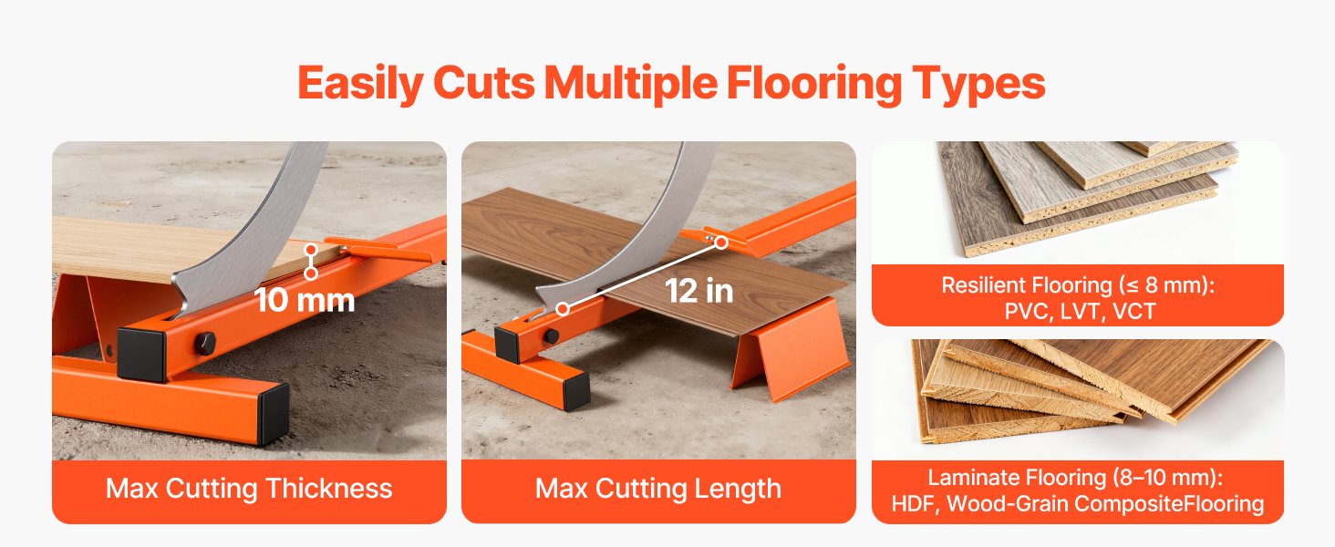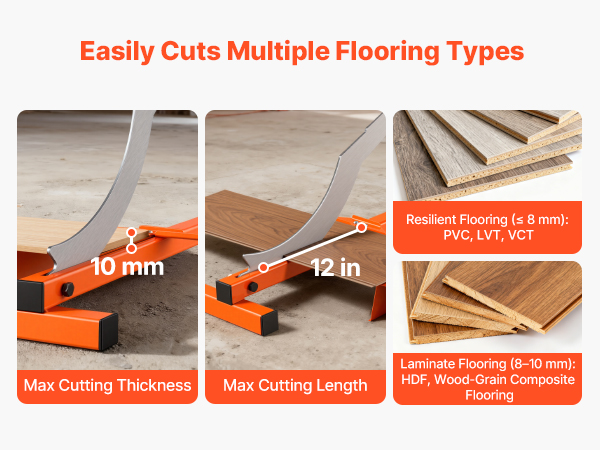- Multi-Floor Compatibility: As a laminate floor cutter, it cuts resilient flooring (PVC, LVT, VCT, rubber, polyurethane) and 8–10 mm laminate flooring, meeting your flooring renovation needs across different spaces