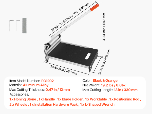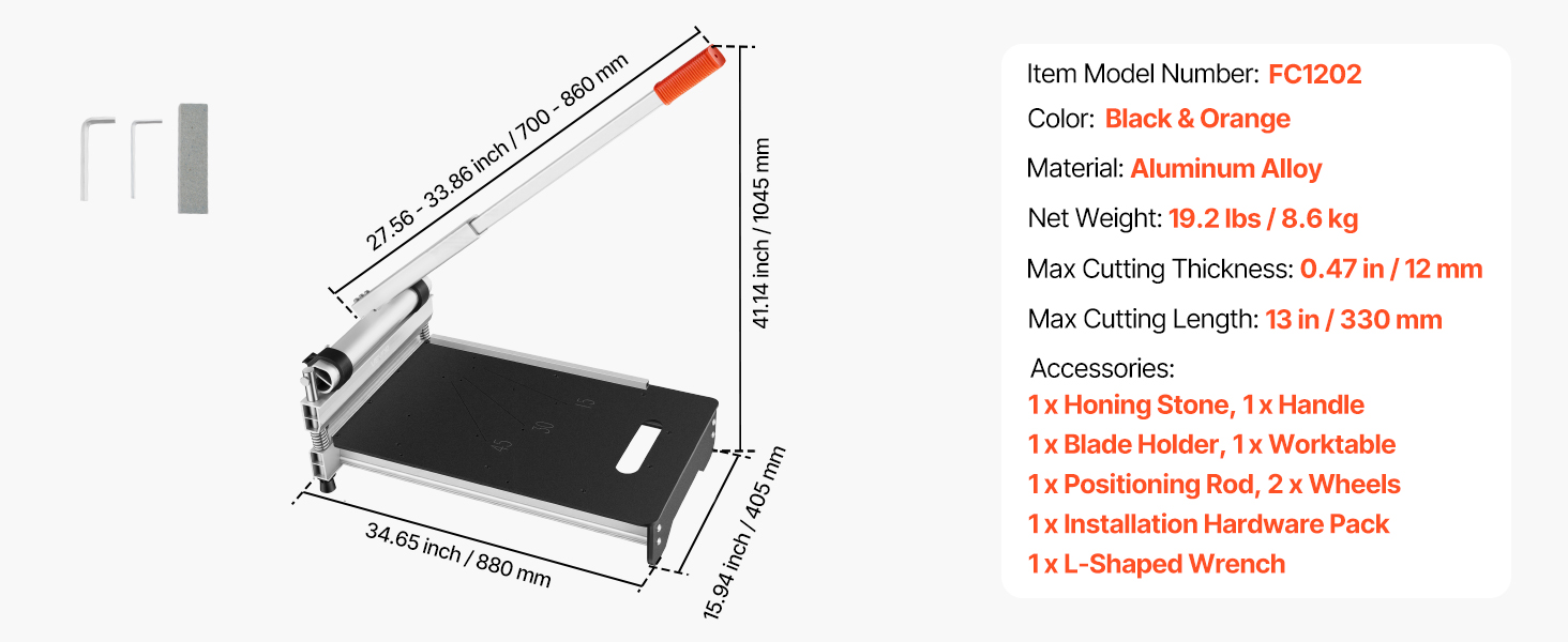 Assembly instructions are totally WRONG although if your mechanically inclined you can figure it out.. Took about 20min. looking at pictures of it. Got to Installing the blade 9″ Supposed to be 13″.. Had a big job the next day Sent a Email to Vevor CS. Got back to me quickly After a few Emails Tonia (very nice ) informed me the blades was being shipped from China and would take 15 days. But the good part was my job was all 7.25″ Straight cuts so the 9″ blades worked. They shipped my 2 – 13″ blades got in about 10 days. These blades are very sharp and heavy duty. I now have 2- 9″ and 2- 13″ Blades. This Lam Floor Cutter saved me a lot of time. Easy to use.. Makes nice clean cuts. Did a 190 sq ft floor with no problems blade still cutting clean. you get a sharing stone But have not needed that yet. I would recommend this cutter.