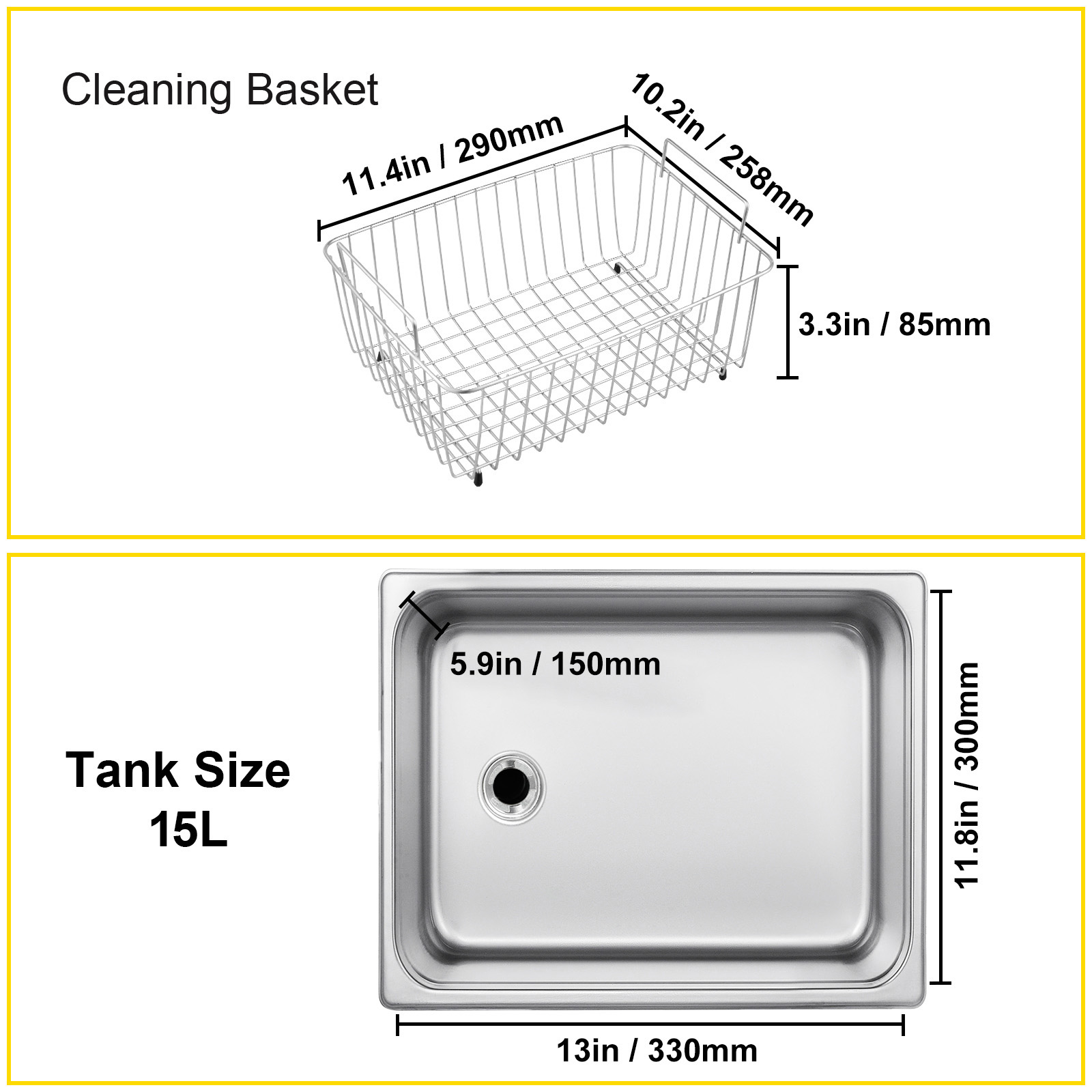 - Tank Capacity: 13.5-15L (Since the bottom of the ultrasonic cleaner is a curved surface, the actual volume will be smaller.)