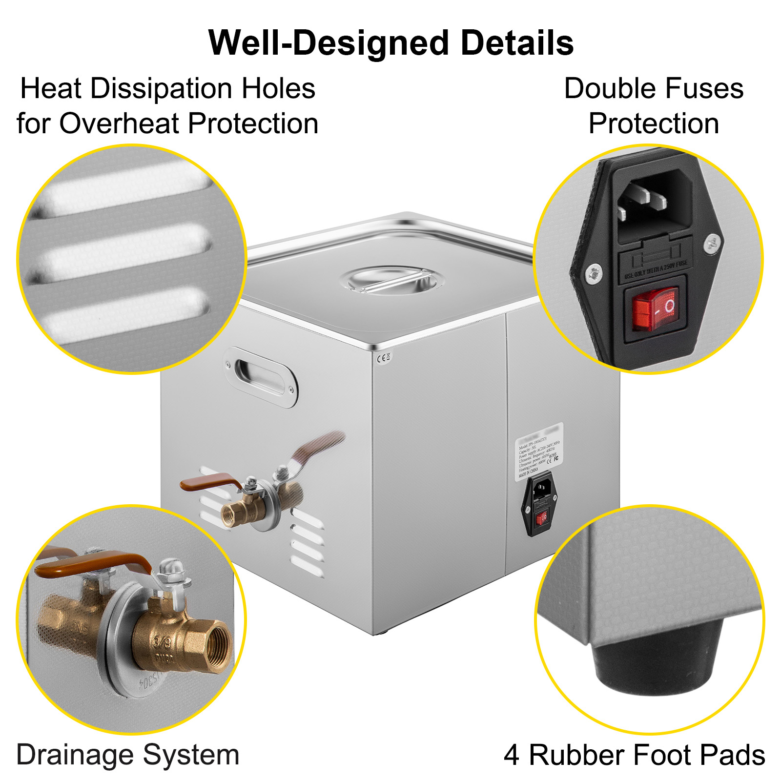 This ultrasonic parts cleaner is made from 304 stainless steel with a noise reduction lid and built-in handles on both sides, designed for durable use and easy cleaning.