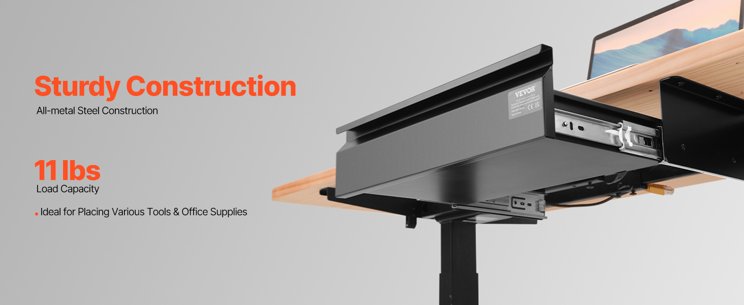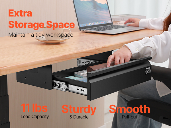 The under desk drawer provides an additional 11 lbs of storage capacity, helping you keep your workspace tidy and organized. Say goodbye to cluttered surfaces and enjoy a more organized, efficient work setup.