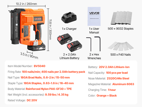 - Cordless Convenience: This cordless nail gun is powered by two 2.0Ah battery packs. The cordless design enables mobility and flexibility during work. Ideal for hard-to-reach areas or mobile tasks, it ensures uninterrupted work and improved efficiency