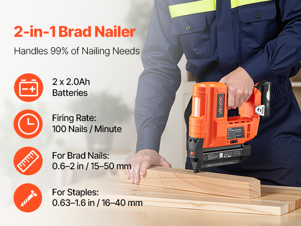 - Versatile 2-in-1 Use: Compatible with 0.6-2.2 inch (15-55 mm) brad nails and 0.6-1.6 inch (16-40 mm) staples, this cordless brad nailer is suitable for trim installation and furniture assembly. One tool handles multiple tasks, meeting your diverse needs