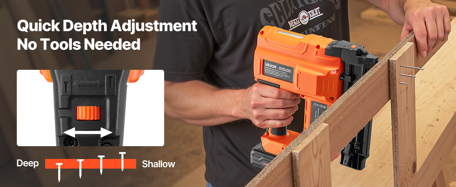 - Tool-Free Depth Adjustment: Our battery powered nail gun easily sets the ideal nail depth without extra tools. Switch quickly between different materials and projects while ensuring each nail is driven at the precise depth for a flawless finish