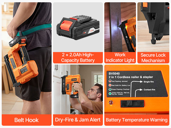 Equipped with a security lock, dry-fire protection, a visible work indicator light, and a jam warning system, this cordless nail gun resists accidental firing and tool damage. Every detail is designed to safeguard you and your workspace.