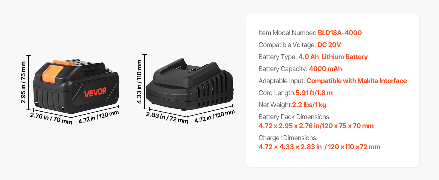 Our battery and charger kit features a 4000 mAh capacity for extended power. With an eco-friendly lithium polymer battery, it’s lightweight and delivers stable performance. The included charger comes with a 5.91 ft power cord for easy and flexible charging, suitable for various cordless tools.