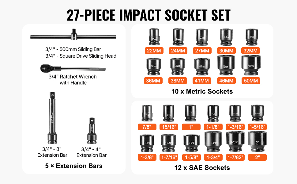 This effort-saving 3/4″ drive impact socket set comes with 22 impact drive sockets: 7/8″, 15/16″, 1″, 1-1/8″, 1-3/16″, 1-5/16″, 1-3/8″, 1-7/16″, 1-5/8″, 1-3/4″, 1-7/8″, 2″; 22 mm, 24 mm, 27 mm, 30 mm, 32 mm, 36 mm, 38 mm, 41 mm, 46 mm, 50 mm.