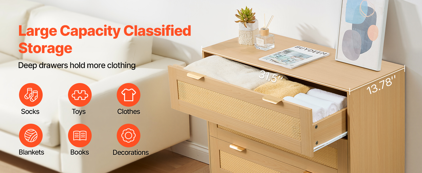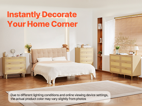 Our spacious rattan dresser provides multi-layer storage space. Featuring deeper and wider drawers, it can store a large amount of clothes and daily necessities in a classified manner. The top surface holds decorations or frequently used items, meeting diverse home organization needs.