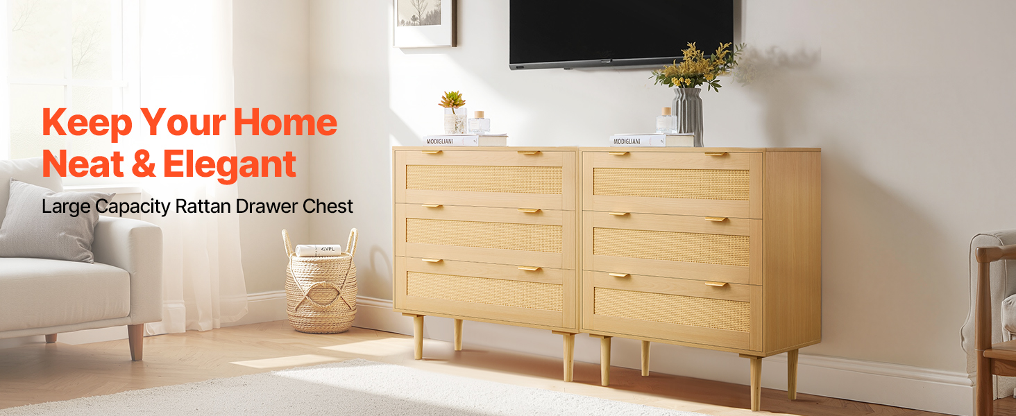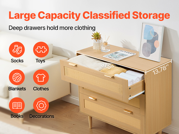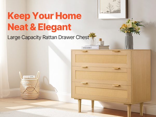 • Spacious Rattan Dresser: This rattan dresser for bedroom features 3 drawers, each deepened to 7.4 in/18.8 cm, providing ample storage space for clothes, books, blankets, and toys. Its wide top surface is ideal for displaying photo frames and decorations.