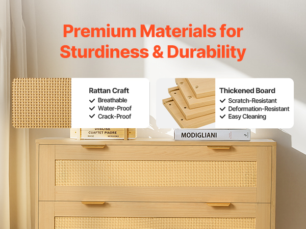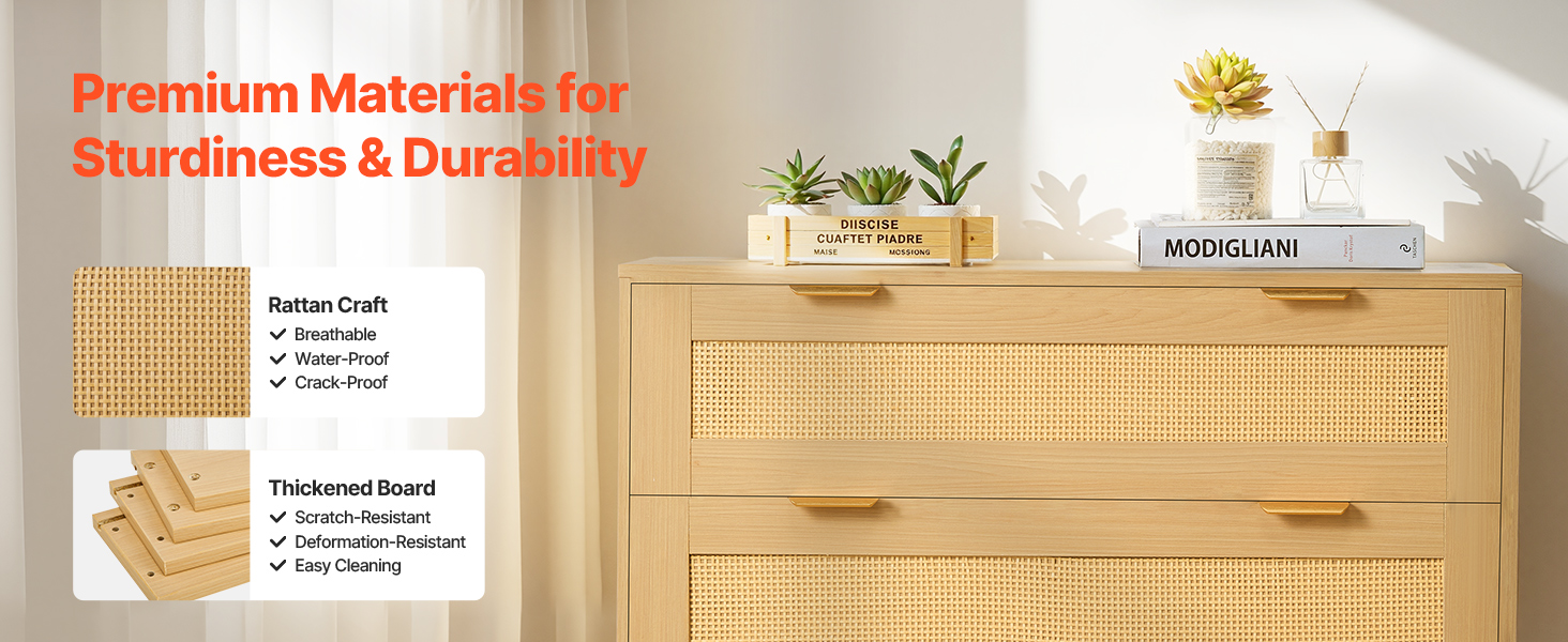 • Sturdy & Long-Lasting: Constructed from particleboard, our rattan chest of drawers resists wear, scratches, and bending. Roller tracks ensure smoother sliding, while 6.3 in / 16 cm wood legs keep the cabinet dry and allow easy vacuum cleaner access.