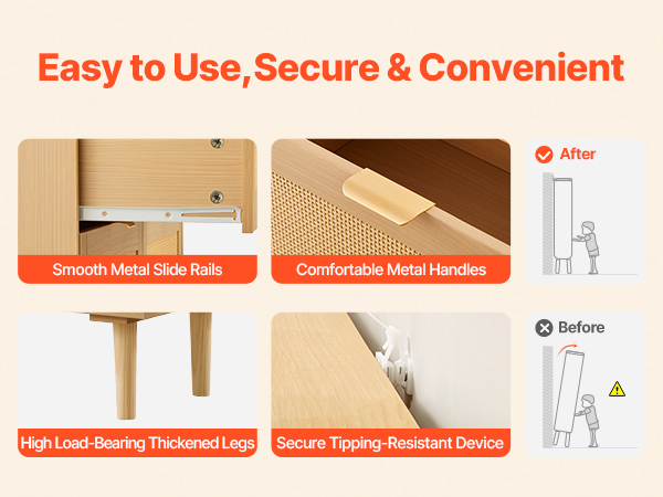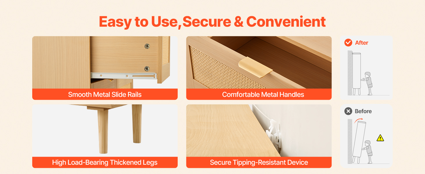 Our boho dresser comes with metal handles that provide a comfortable grip, paired with sliding rails that remain smooth when pushing and pulling. Its high-load-bearing legs and anti-tip device ensure reliable use, withstanding the wear of daily use, keeping it looking like new for a long time.