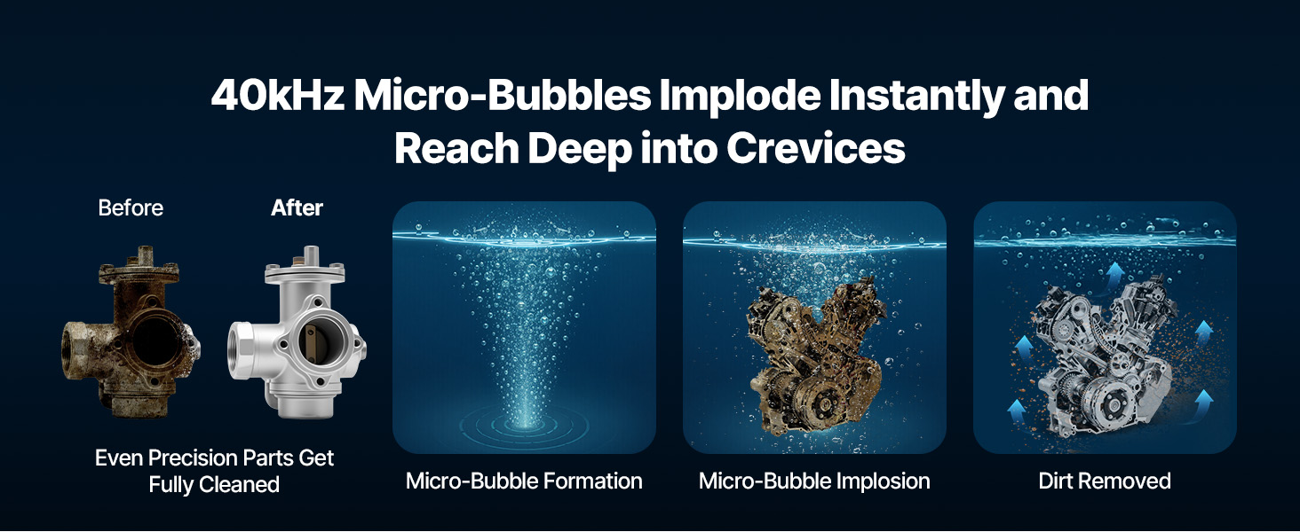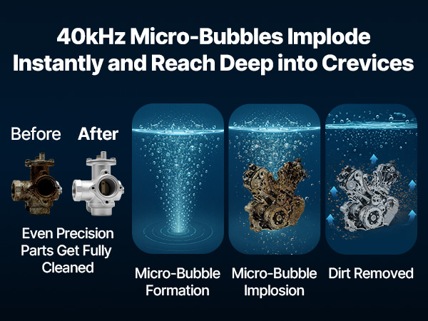 - Powerful Cleaning Performance: 40kHz ultrasonic waves generate 40,000 microbubbles per second, “bursting” like thousands of tiny brushes. They remove grease, dirt, and debris from carburetor channels, airbrush tips, watch band, small hardware and more