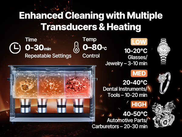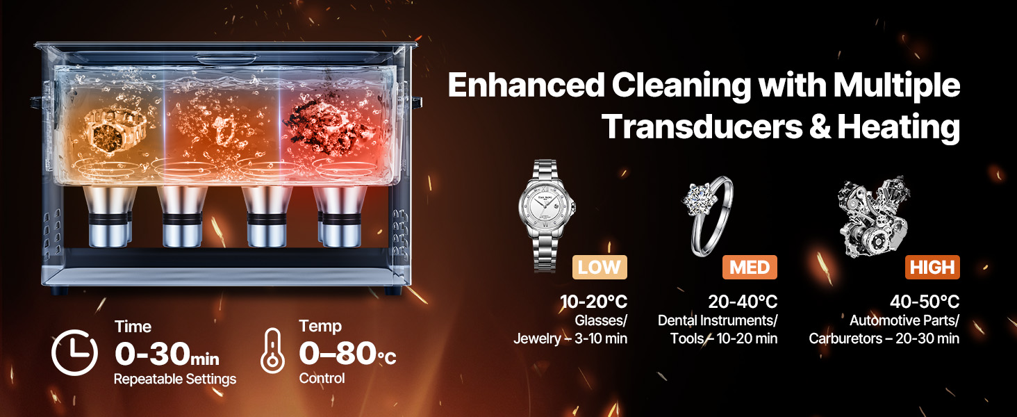 - Suitable for Multiple Materials: Ideal for jewelry, watches/electronic components, or industrial parts with heavy oil stains. Adjustable cleaning temperatures from 0–80°C accelerate the dissolution of dirt, providing a more efficient and targeted clean
