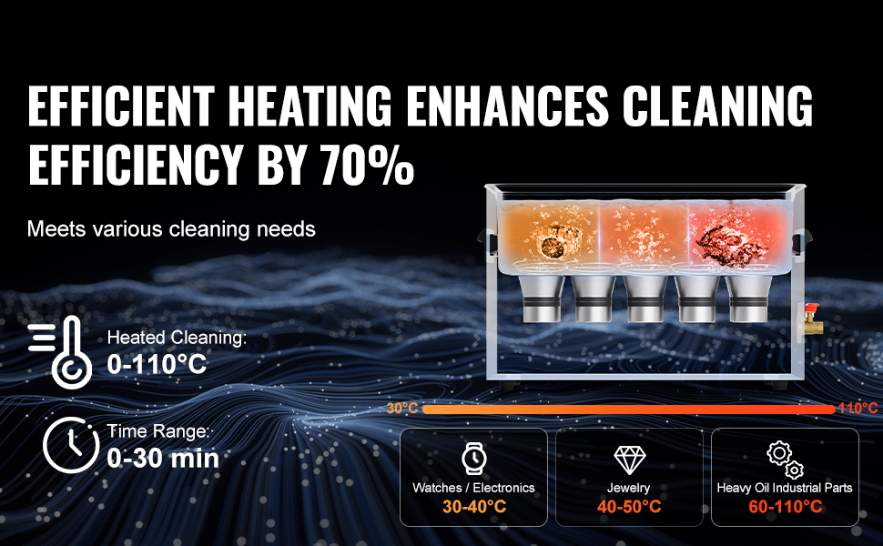- Heated Cleaning: For different items such as jewelry, watches/electronic accessories, and heavy grease industrial components, you can control the cleaning temperature from 0-110°C to accelerate the dissolution of dirt. This provides more efficient and targeted cleaning results. The high-temperature mode quickly breaks down stubborn grease, while the low-temperature mode gently protects sensitive materials.
