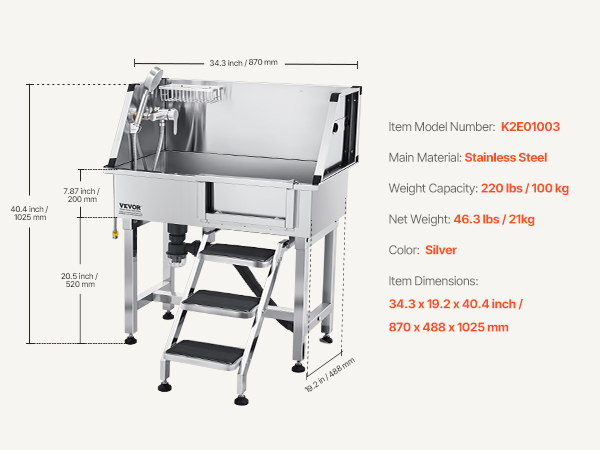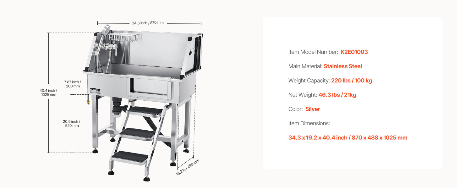 This bath works great for my 100 pound plus dogs – perfect height – no more straining back – the dogs like it better aswell much easier getting in/out for them. Only thing that I’ve noticed that could be improved is adding a latch so the sliding door stays shut I’m to add one myself. Worth the money.
