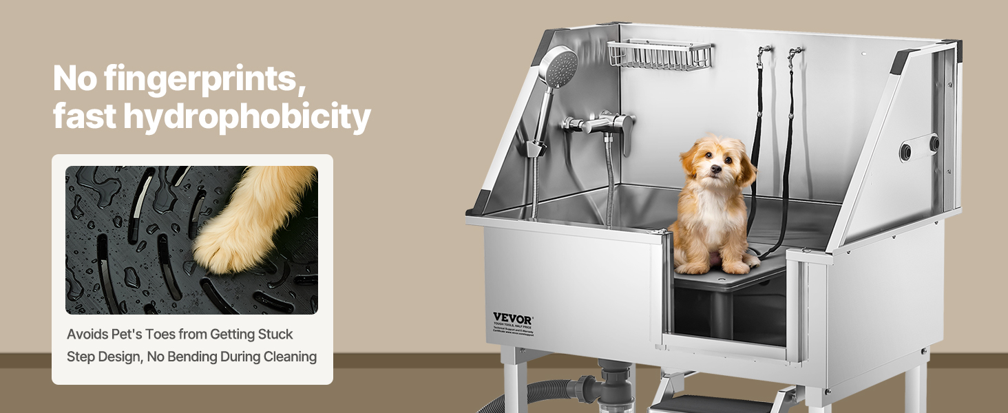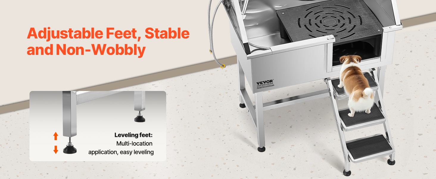 So far I love my VEVOR 50″ Pet Dog Bathing Station w/Ramp, Professional Stainless Steel. It’s easy to use. I feels sturdy when I bath the dogs. I’ve bathed a Standard Poodle, and two sturdy Labradoodles. Still very much worth the price and good quality.