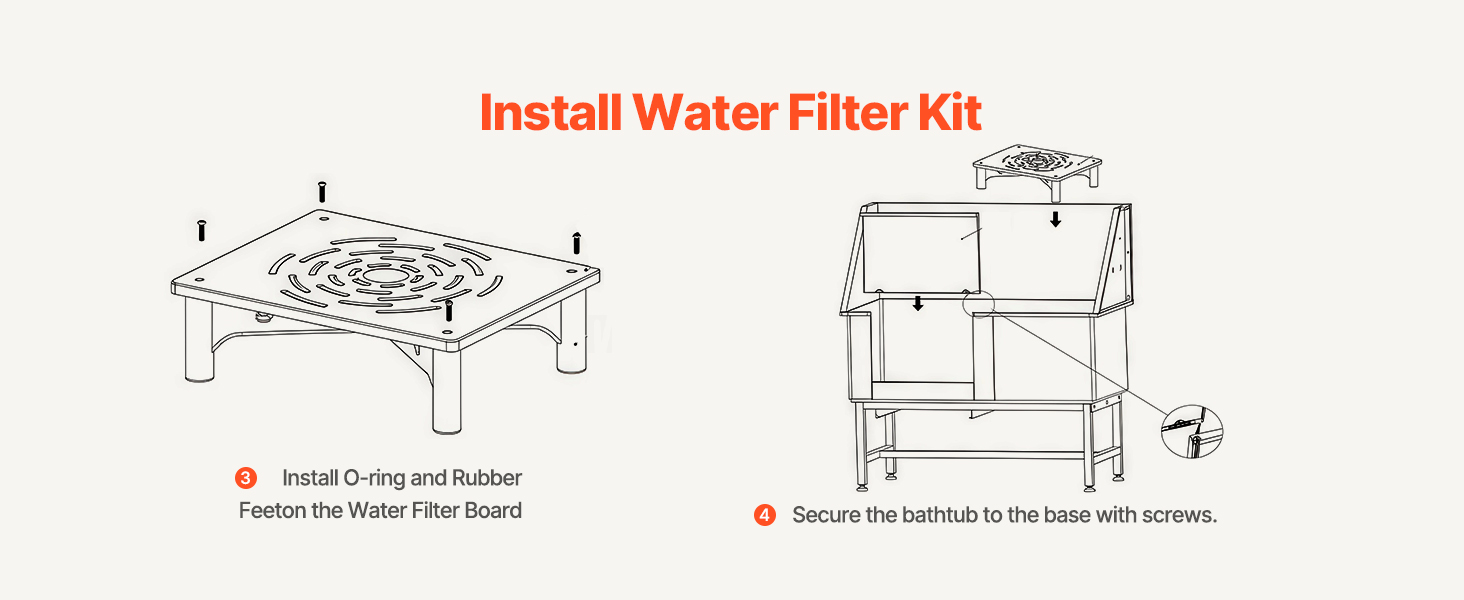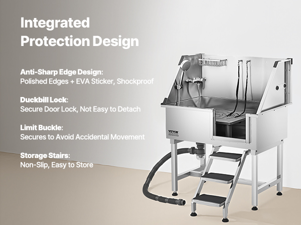 - Integrated Design: The dog grooming tub is featuring hot and cold faucets, a dual-control showerhead, and a soap holder, this design makes pet bathing effortless and efficient. The PE water filter board provides a non-slip draining surface, while the included duckbill buckle stops pets from accidentally triggering the door during bath time, keeping them securely inside