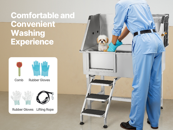 - More Comfortable Grooming: The hot and cold dual-control faucets and three water pressure settings provide versatility. The aluminum alloy soap holder keeps cleaning supplies handy, making pet grooming more convenient