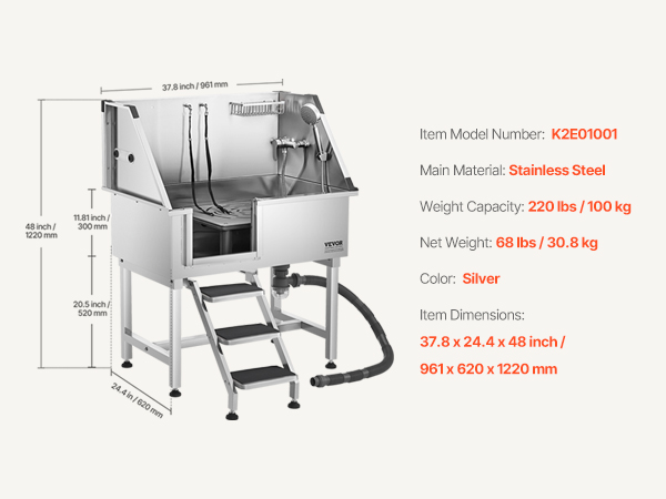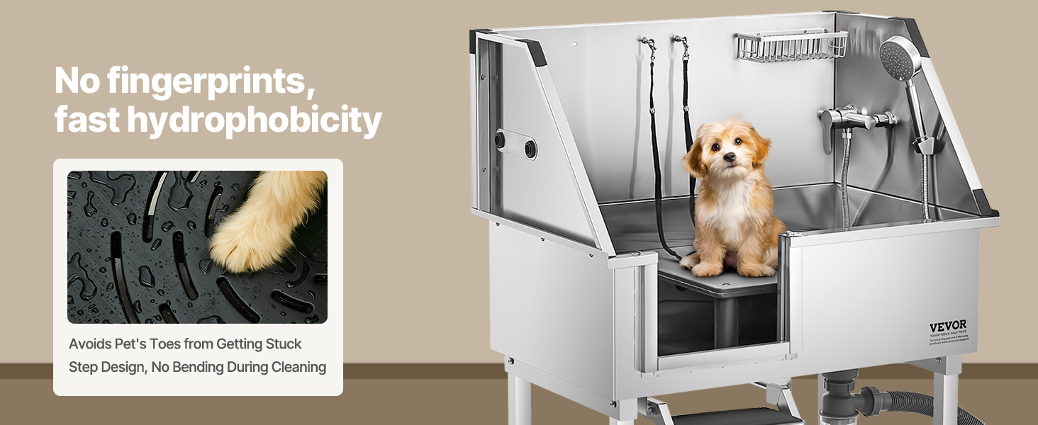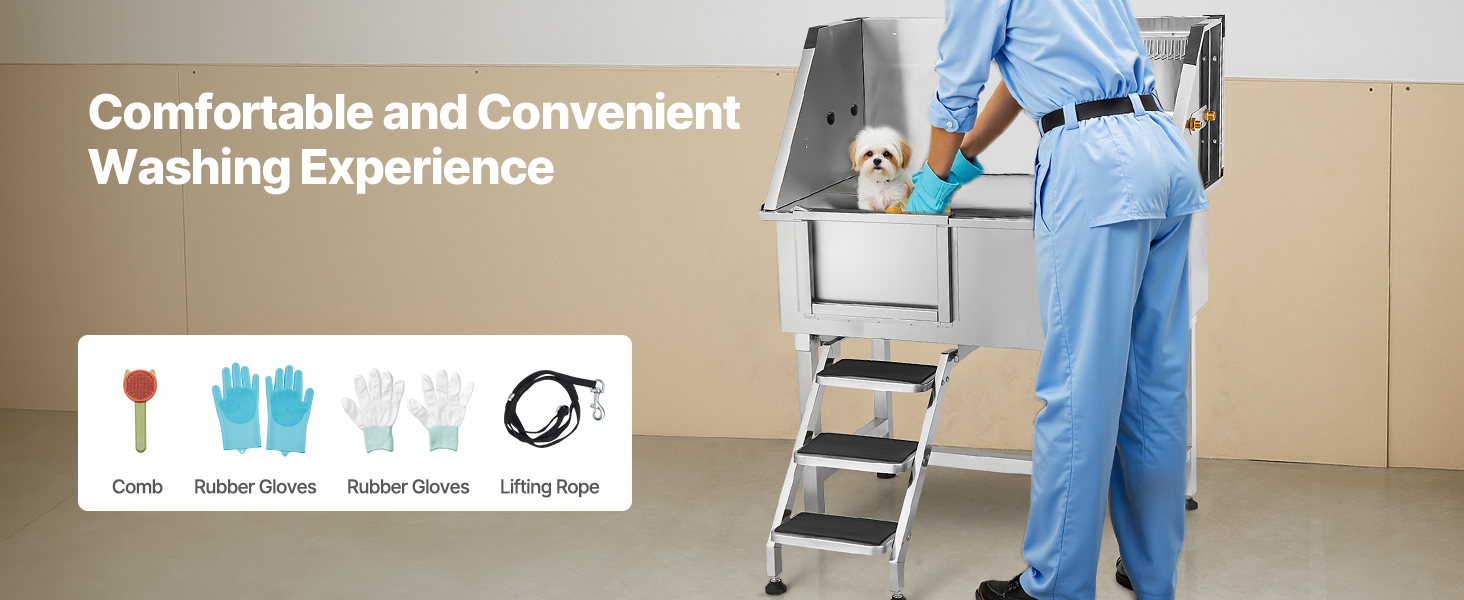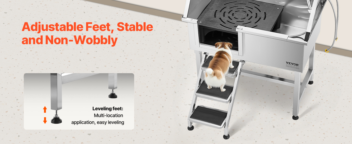So far I love my VEVOR 50″ Pet Dog Bathing Station w/Ramp, Professional Stainless Steel. It’s easy to use. I feels sturdy when I bath the dogs. I’ve bathed a Standard Poodle, and two sturdy Labradoodles. Still very much worth the price and good quality.
