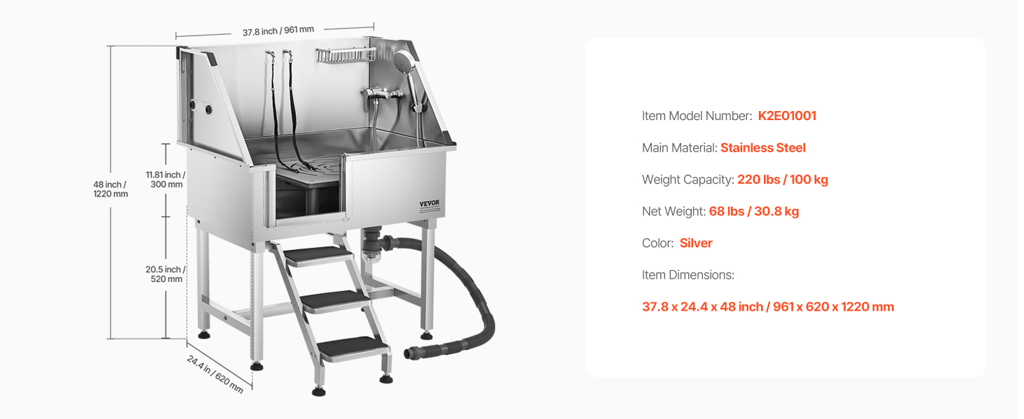 The Vevor 38in Stainless Steel Dog Washing Station is an absolute game-changer! I wasn’t sure if our 40 lb heeler would fit, but she fits perfectly—and it also works great for our smaller poodles. The station was fairly easy to assemble; however, we did need to use different hoses since our home’s water valve connections weren’t compatible with the ones provided. Other than that, we had zero issues with assembly, no leaks during bath time, and found it to be extremely convenient. Highly recommend!
