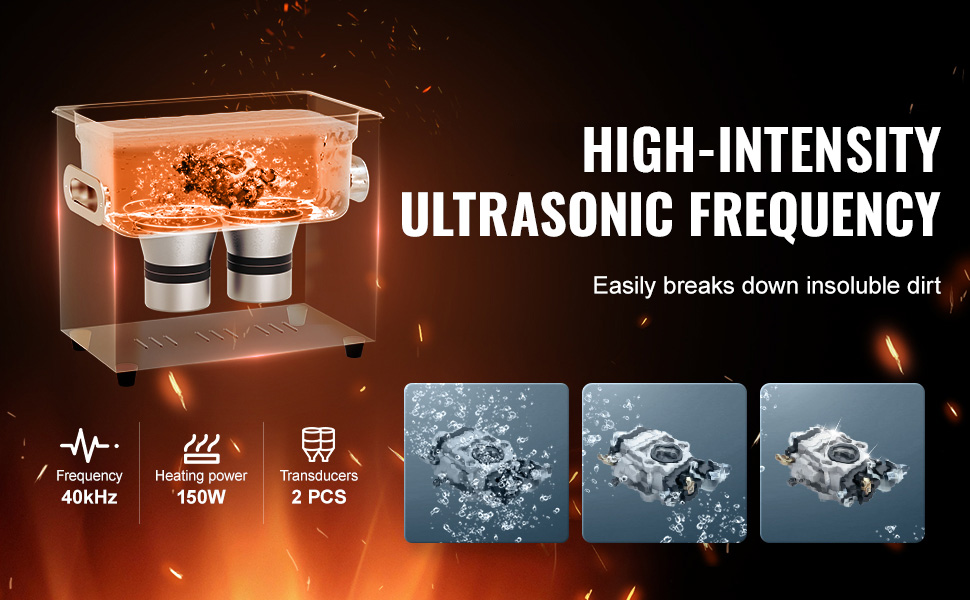 - Powerful Cleaning Performance: The VEVOR Ultrasonic Cleaner operates at an ultra-high frequency of 40kHz, generating millions of tiny bubbles that explode in water, releasing strong cleaning energy. This energy penetrates every crevice, thoroughly removing stubborn stains from delicate parts, ensuring no area is left uncleaned.