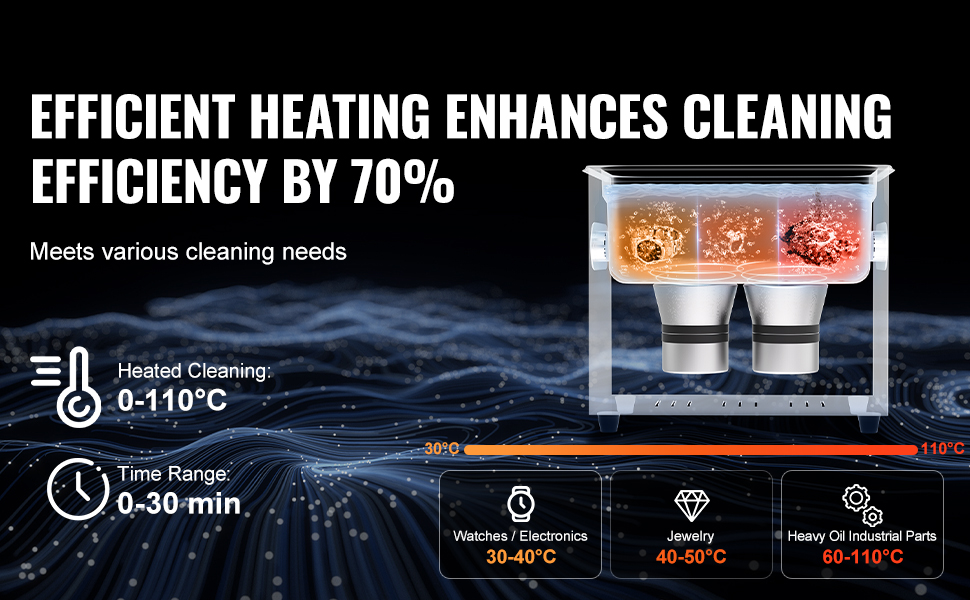 - Heated Cleaning: For different items such as jewelry, watches/electronic accessories, and heavy grease industrial components, you can control the cleaning temperature from 0-110°C to accelerate the dissolution of dirt. This provides more efficient and targeted cleaning results. The high-temperature mode quickly breaks down stubborn grease, while the low-temperature mode gently protects sensitive materials.