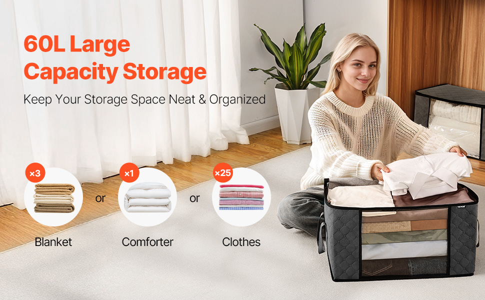 The 60L extra-large capacity clothes storage bins can neatly organize your seasonal clothing, blankets, comforters, pillows, toys, and other household items. They help make your storage space tidier and more organized.