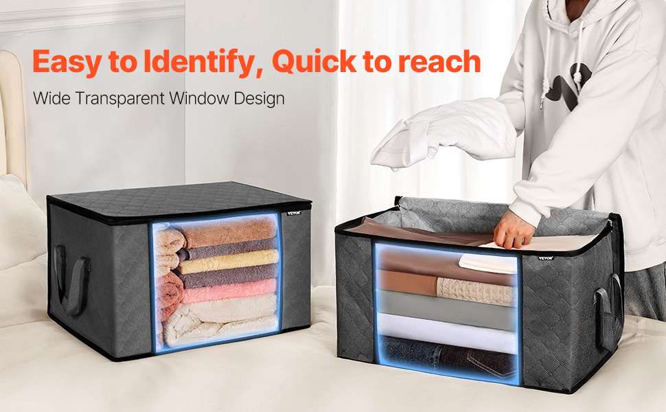 - Easy to Identify: The foldable closet organizers storage containers feature a large transparent window for clear visibility, enabling quick identification of contents without opening the bag. This facilitates effortless daily retrieval and storage of items.