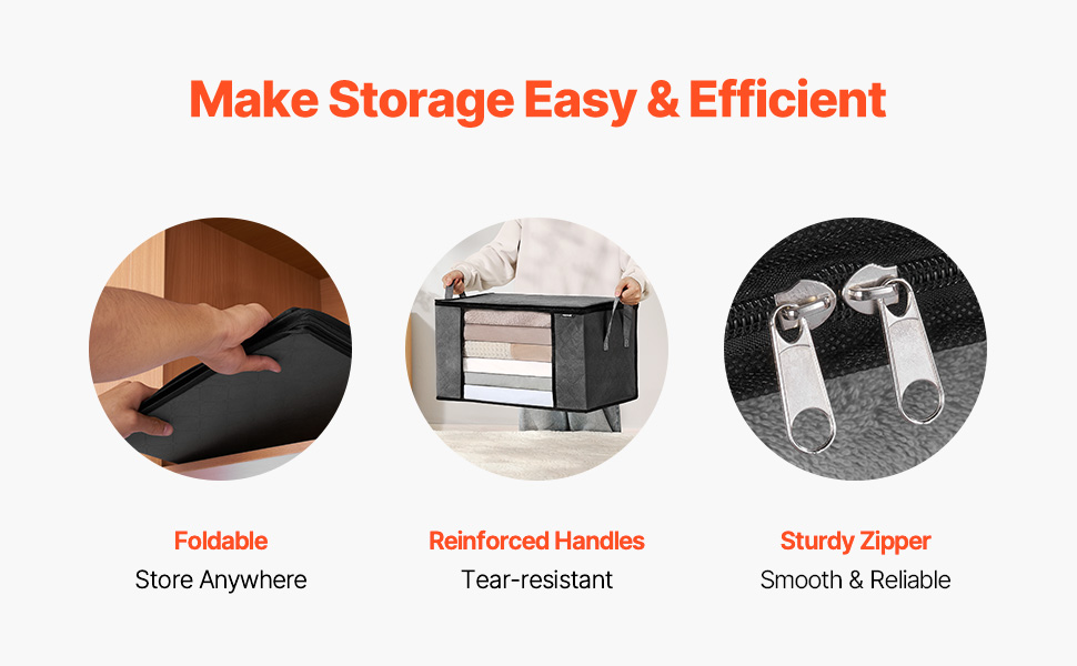 The reinforced side handles make the bags easy to move or carry. Equipped with a dual metal zipper, these storage bags are sturdy, durable, and open and close smoothly. They are also foldable, so when not in use, they won’t take up your valuable living space.