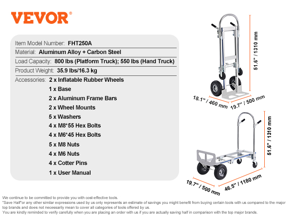 - High Load Capacity: Ready for some heavy lifting? Meet your new best friend. With a hearty weight range of 550 to 800 pounds, this hand truck won't break a sweat for hauling, carrying, or transporting. Platform Truck Mode Size: 19.7"L x 46.5"W x 40.6"H; Hand Truck Mode Size: 19.7"L x 18.1"W x 51.6"H.