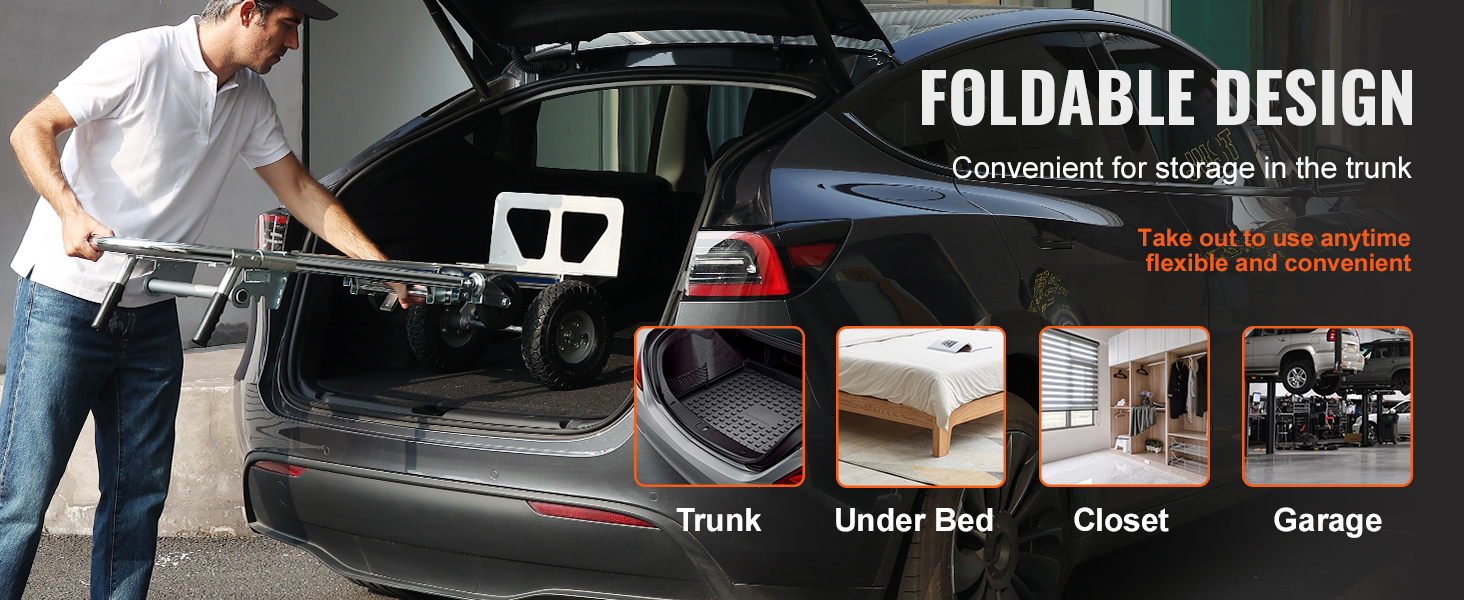 When you’re done, just fold this convertible hand truck up and stash it in your trunk. This space-saver is there when you need it, whether you’re grocery shopping or moving mountains.