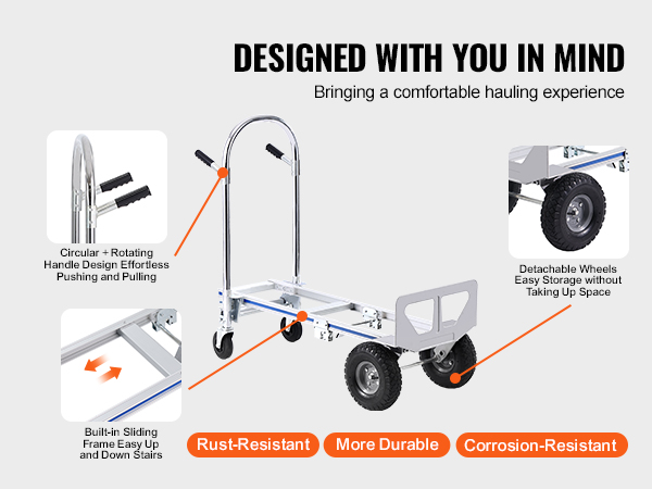 - Tough as a Tank: Our hand truck dolly's reinforced aluminum and carbon steel frame combines the best of both worlds: lightweight for easy toting and sturdy for heavy-duty tasks. Oh, and did we mention it? It is corrosion-resistant and rust-proof, ensuring a durable, reliable, and convenient user experience.