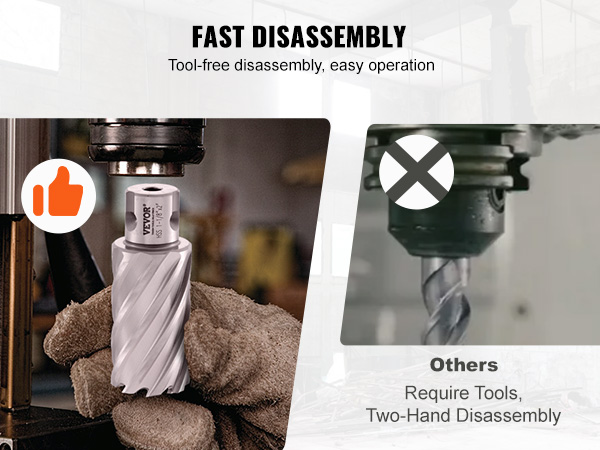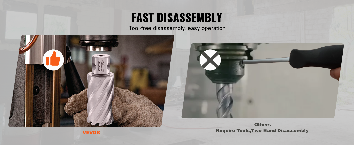 - Quick Detach in 1 Second: This slugger cutter is especially suitable for scenarios where you can't spare an extra hand for operation in high-altitude work. No more hassle with the tedious process of changing bits. You can quickly replace the drill bit with just one hand. No need to pause or waste time, keeping your work smooth and uninterrupted.
