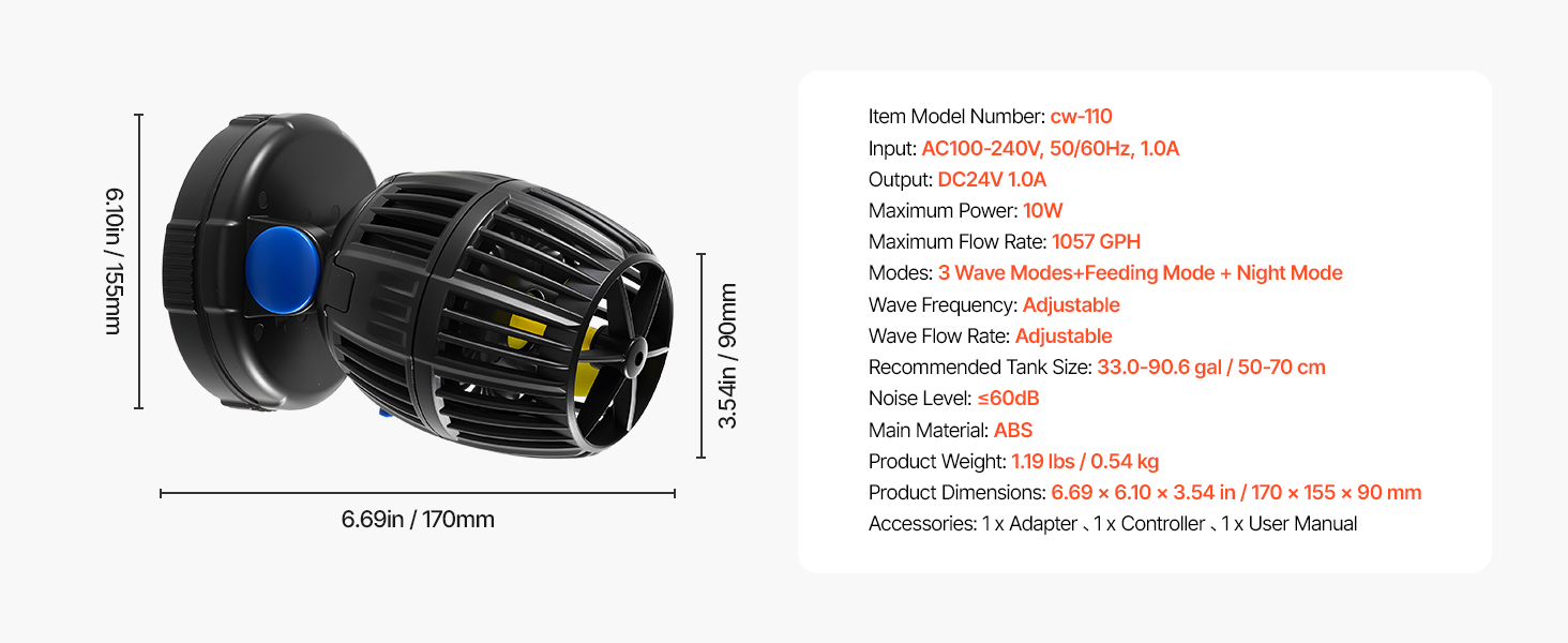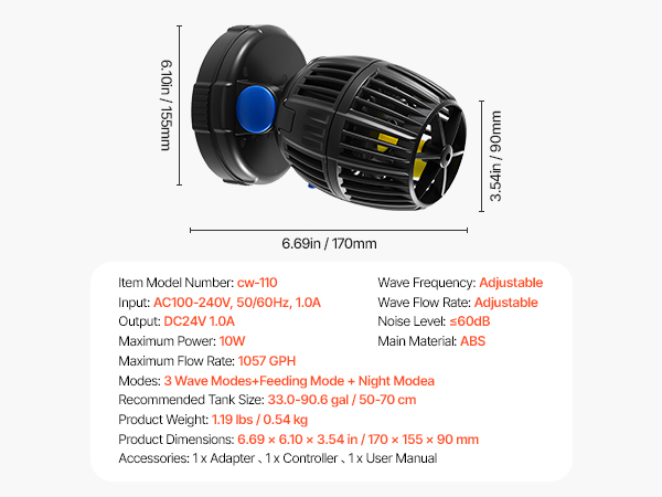 • Compact & Efficient: Designed for efficiency, our small yet powerful fish tank wave maker delivers up to 1057 GPH with only 10W of power consumption. Ideal for 50-70 cm aquariums, it operates securely with a 24V DC low-voltage power supply