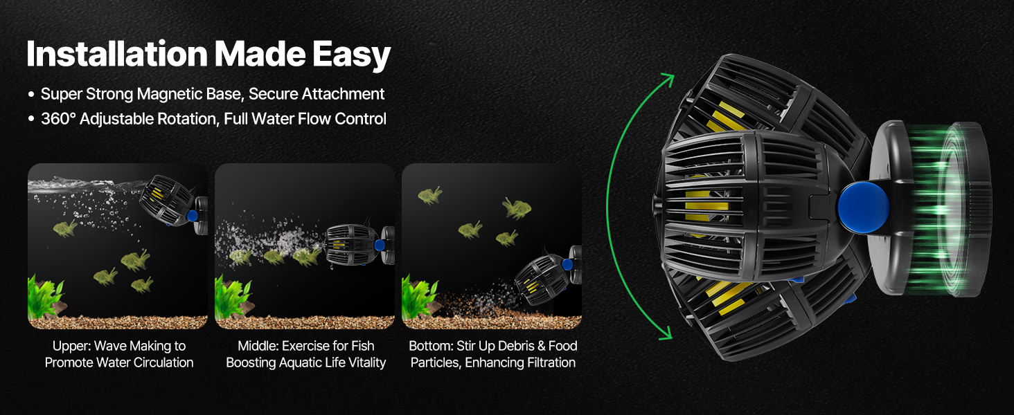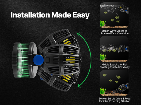 Quick and hassle-free installation! This wavemaker for saltwater aquarium provides 360° water flow simulation, enhancing water circulation and improving water quality by reducing waste buildup.