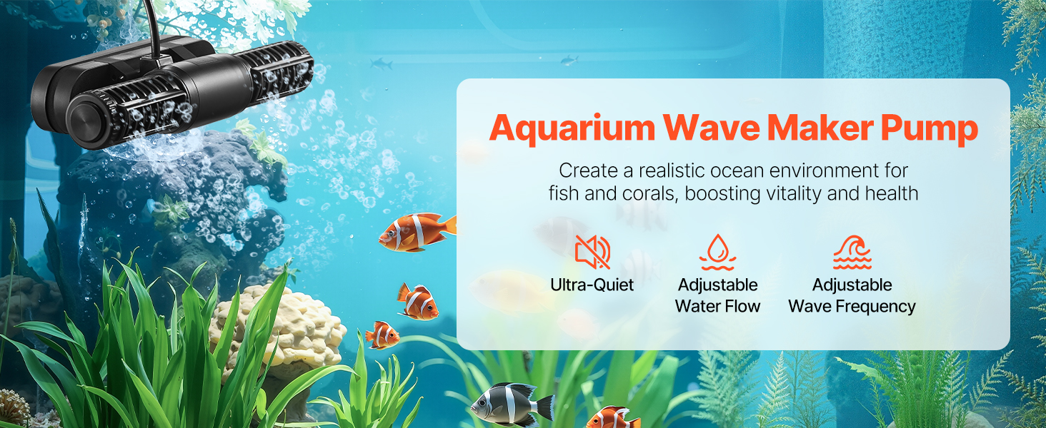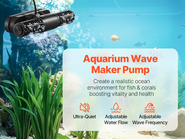 - Dual-Direction Wave Making: This aquarium wave pump features a 15W high-efficiency motor and a 1428 GPH max flow rate. Its dual-direction wave-making functionality and adjustable angle allow for full-range water circulation and a clean environment